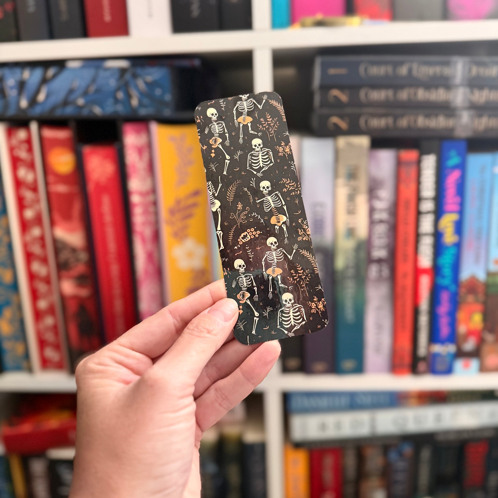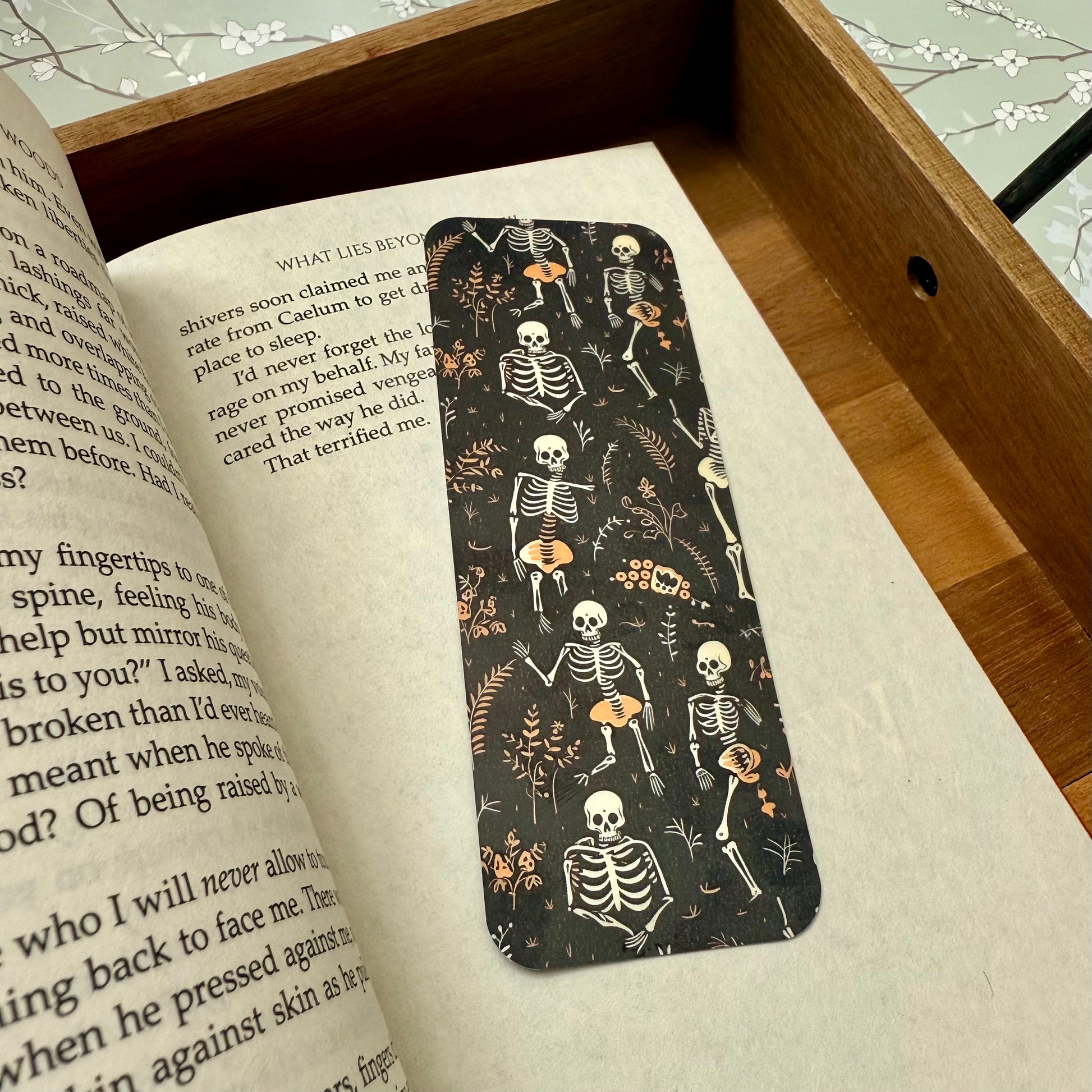 Spooky, whimsical, and perfect for your next read! This double-sided bookmark features a playful skeleton design surrounded by mushrooms and fall foliage—ideal for fans of dark fantasy, witchy reads, or cozy autumn vibes.