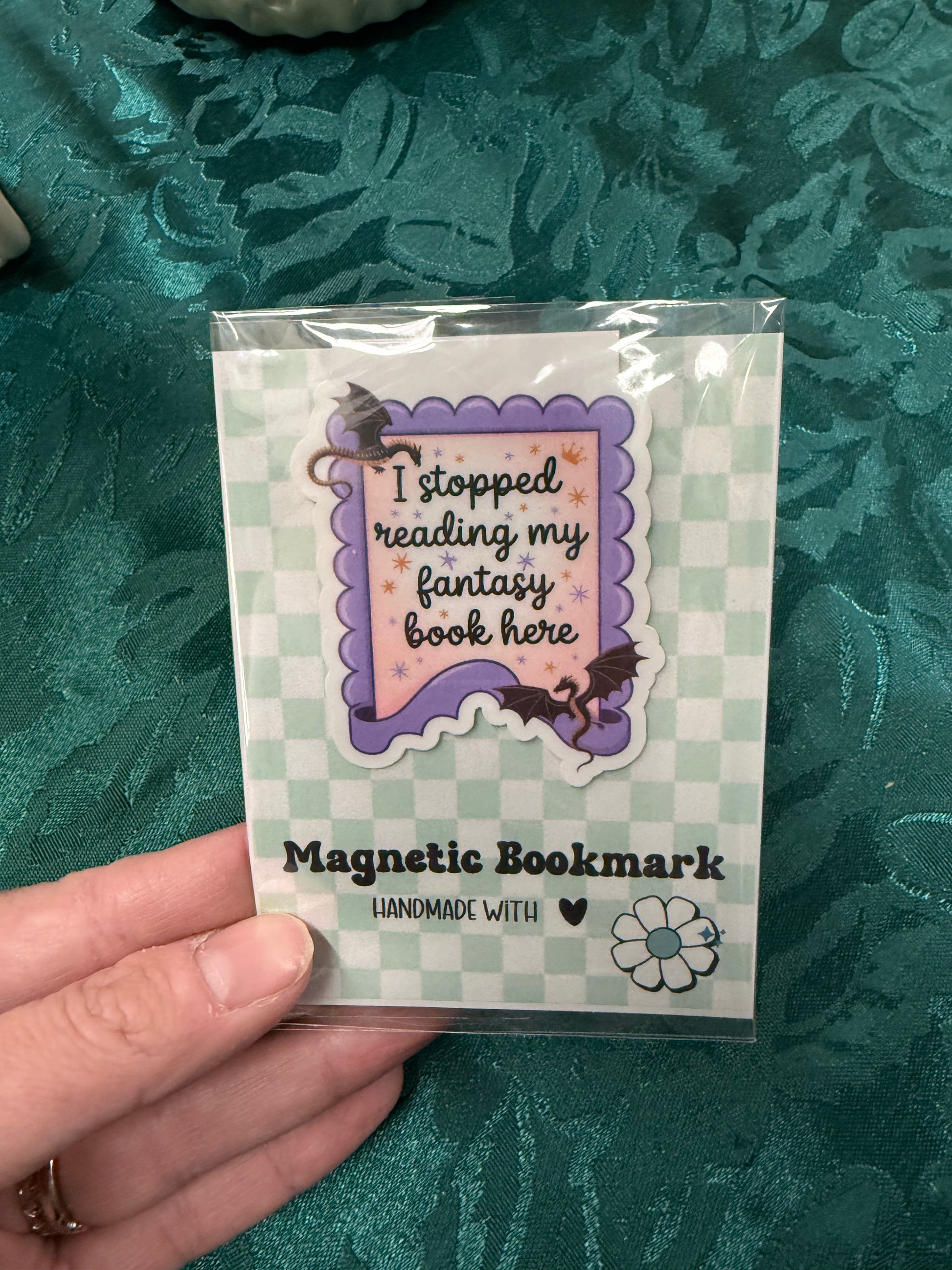 Never lose your place in your favorite fantasy read again! This handmade magnetic bookmark is perfect for readers who love dragons, magic, and a touch of whimsy. Featuring the phrase “I stopped reading my fantasy book here” with a cute bat-winged dragon illustration, this bookmark clips securely to your page with strong internal magnets.